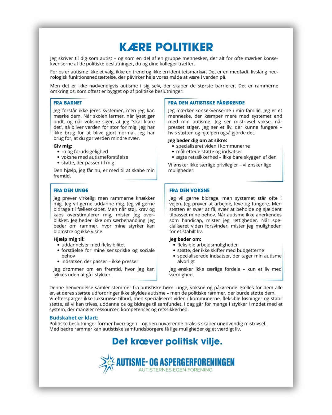Denne henvendelse samler stemmer fra autistiske børn, unge, voksne og pårørende. Fælles for dem alle er, at deres største udfordringer ikke skyldes autisme – men de politiske rammer, der burde støtte dem. Vi efterspørger ikke luksuriøse tilbud, men specialiseret viden i kommunerne, fleksible løsninger og stabil støtte, så vi kan trives, uddanne os og bidrage til samfundet. I dag går for mange i stykker i mødet med et system, der mangler ressourcer, kompetencer og retssikkerhed.