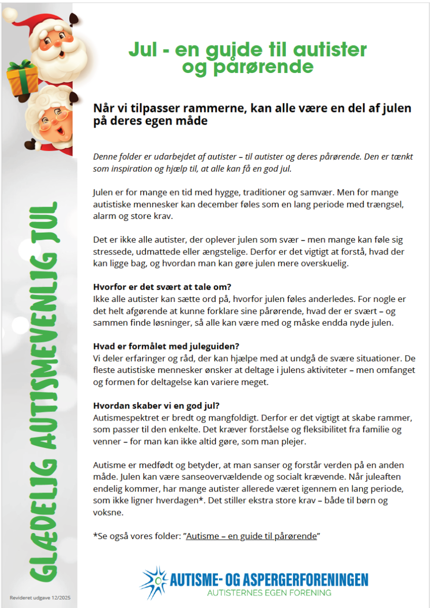 “Jul – en guide til autister og pårørende” er en guide til autister og deres pårørende, der søger at skabe en mere inkluderende og forstående jul. Den beskriver de særlige udfordringer, som mange autister kan opleve i juletiden, og giver praktiske råd til, hvordan man kan tilpasse aktiviteter og traditioner, så alle kan føle sig trygge og glade. Formålet er at fremme dialog og forståelse, så julen kan blive en positiv oplevelse for hele familien.